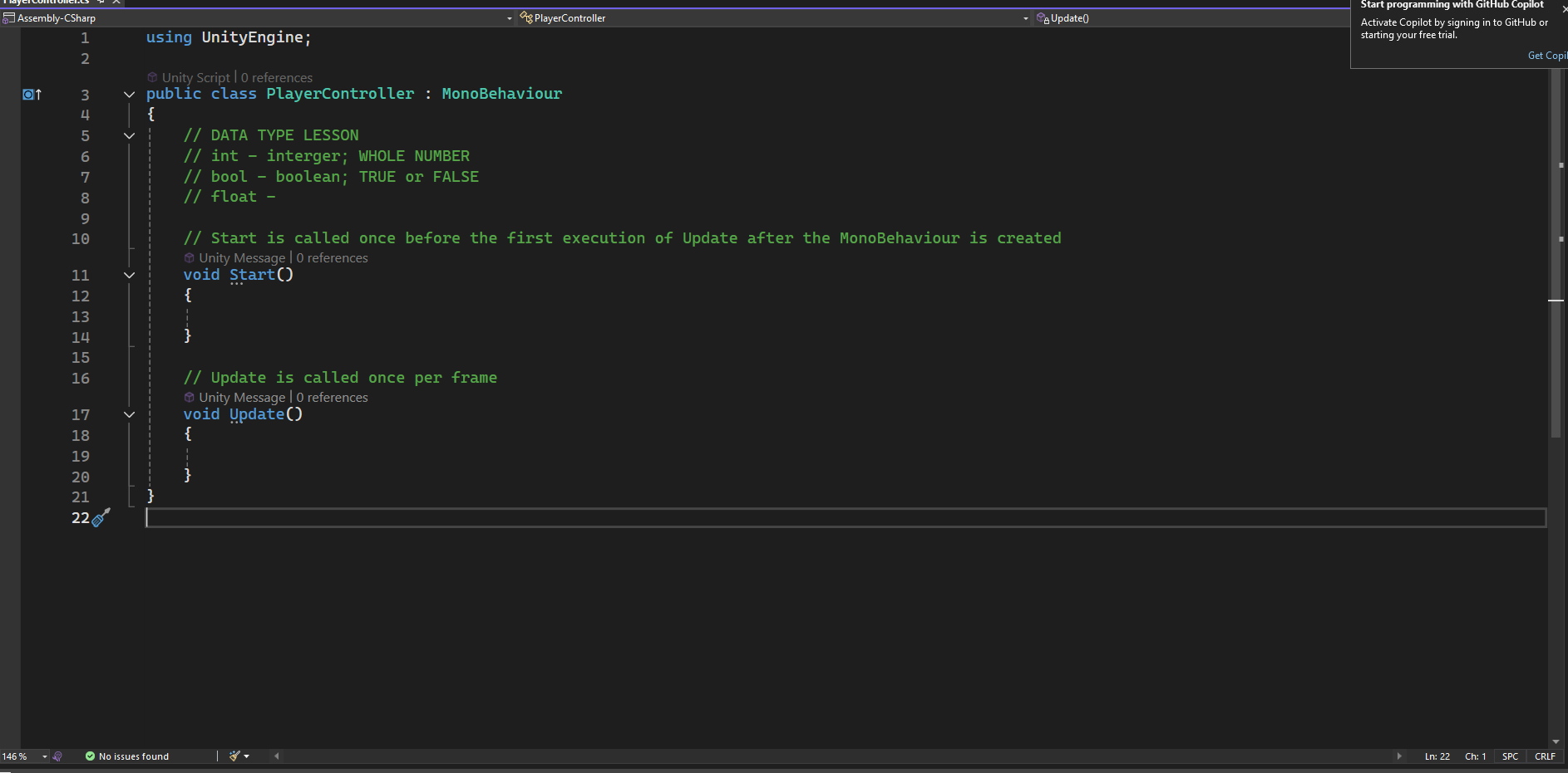 This week, I learned the basics of coding on unity: int, bool, and float. Int is short for integer; any whole number. Bool relates to TRUE or FALSE commands. To write a line/note without affecting the code, you can add to backslashes to the front.